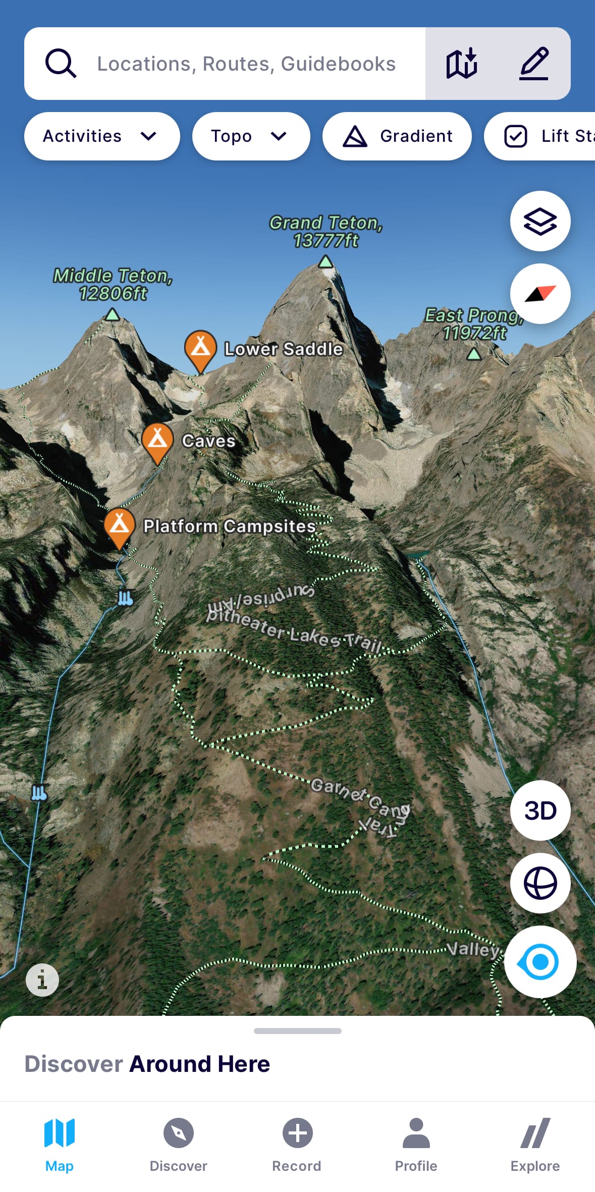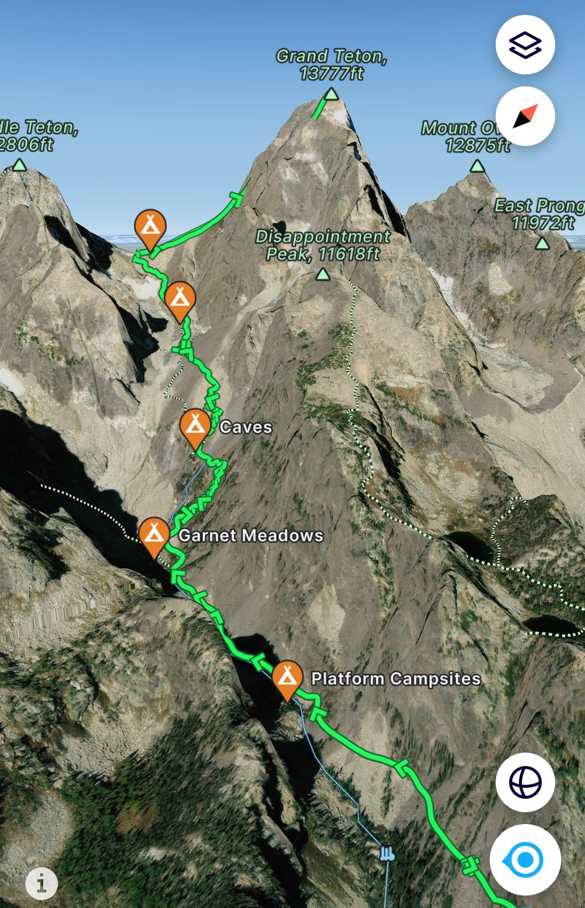 Before Garnet Canyon: The NPS maintains an official series of trails leading to the boulder fields near Platform Campsites / Garnet Meadows, marked by camping pins in the FatMap screenshots below. Many unofficial trails also exist, often referred to as climber’s or social trails. Examples include the Delta Lake trails (more details below) and the old climber’s trail at the core of Michelino’s FKT controversy.