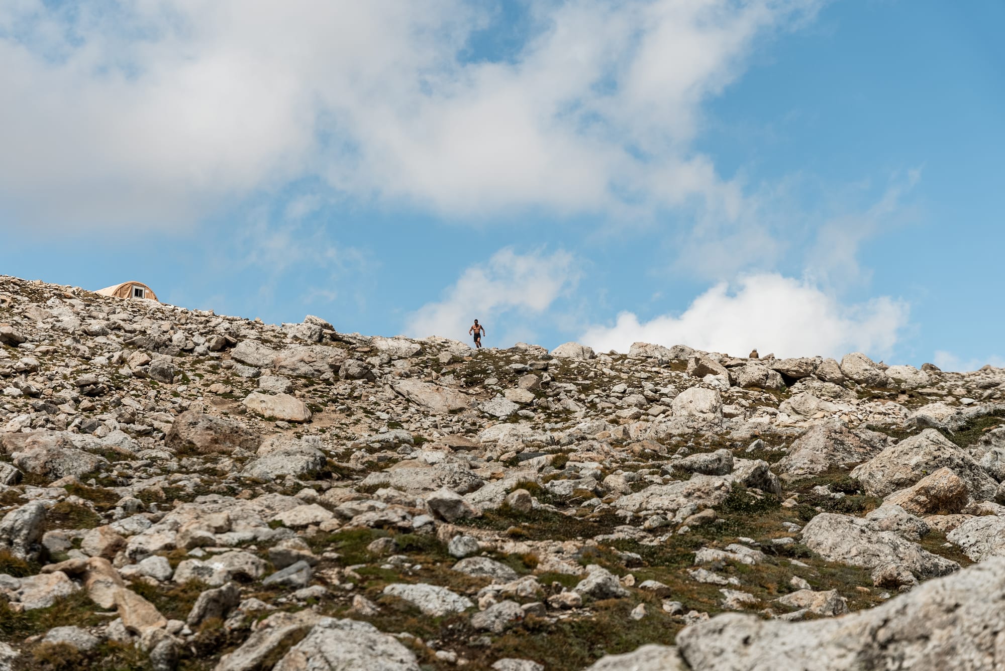 Throughout the summer, thunderstorms in the valley arrive as snow and ice in the high alpine. A week before Michelino’s FKT, a storm deposited a few inches of snow as low as the Lower Saddle, located between Grand and Middle Teton.