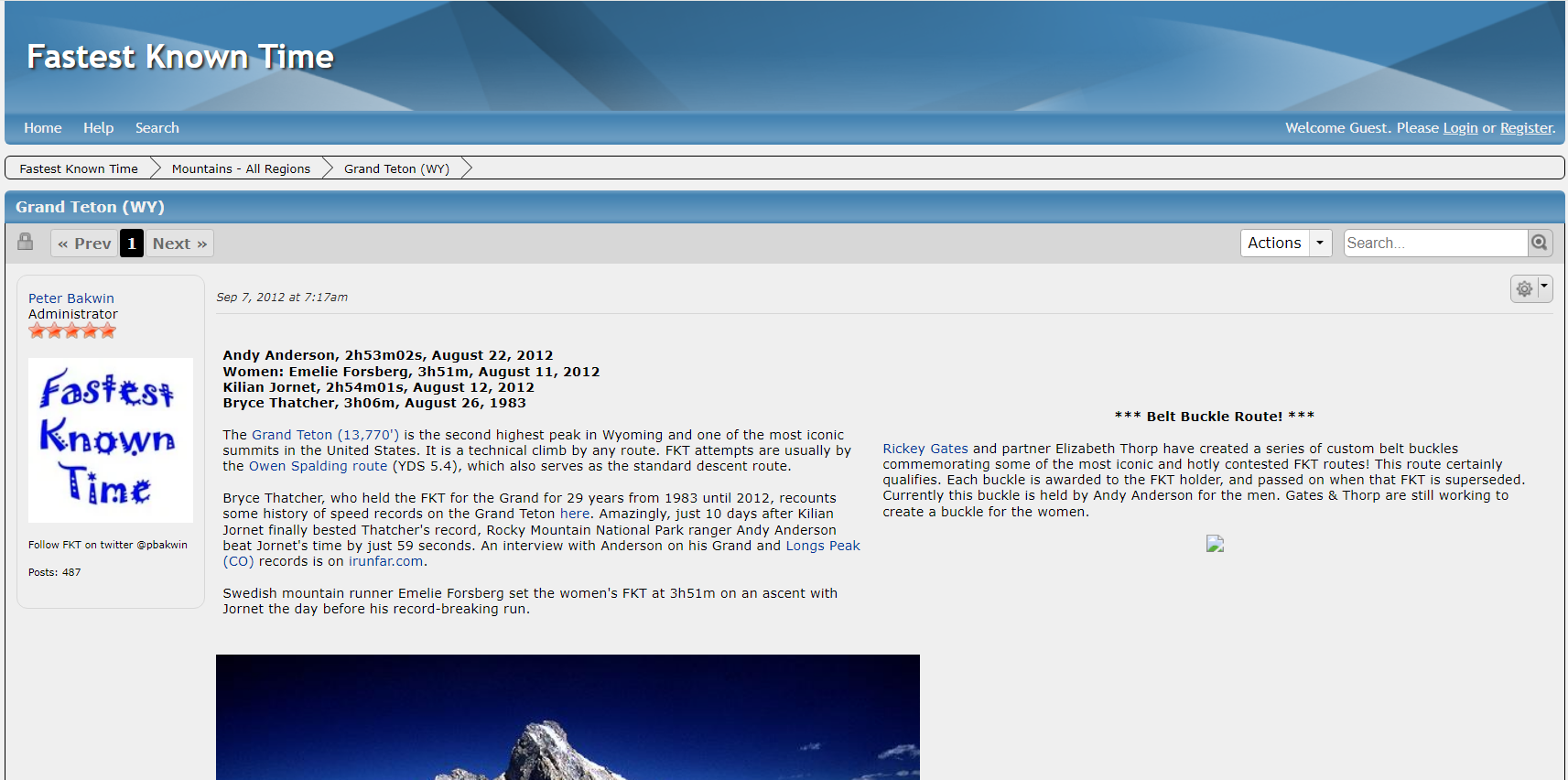 New (post-2018) FKT site before Michelino's attempt, and the original discussion board; neither mentioned controversy around the old climber's trail or added asterisks to prior FKTs