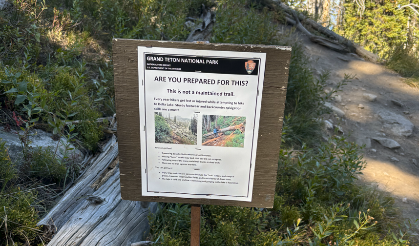 Delta Lake: Arguably the most popular alpine hike in GTNP with over 11K reviews on AllTrails, Delta Lake likely sees tens of thousands of Park visitors each season. The Delta Lake hike is within a mile of the old climber’s trail at the core of Michelino’s FKT controversy (more detail to follow). The NPS posted a sign (below) where hikers leave the official trail to Amphitheater Lake stating, “This is not a maintained trail.”