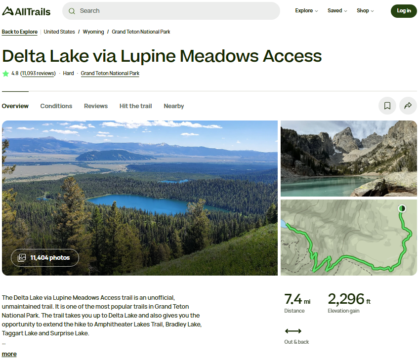 Descending below Garnet Canyon, Michelino followed an old climber’s trail that the NPS alleges was closed. While off-trail travel is generally permitted in Grand Teton National Park (“GTNP” herein), the NPS may close specific areas, subject to specific legal steps. Four of the five FKTs previously accepted by the FKT site also ran the old climber’s trail, one accepted as recently as 2022. Another example of off-trail travel less than a mile from the old climber’s trail is Delta Lake, one of the most popular hikes in GTNP.