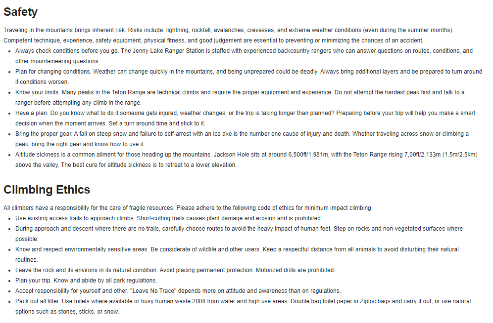 Climbing: The NPS does not maintain official trails to summits in GTNP. Common summits (e.g., Grand Teton, Middle / South Teton, Teewinot, Moran) all have unofficial climber’s trails for portions of the approach. In the words of the NPS, “During approach and descent where there are no trails, carefully choose routes to avoid the heavy impact of human feet. Step on rocks and non-vegetated surfaces where possible.” GTNP does not require permits for climbing in the Park. Access permits are required for backcountry camping.