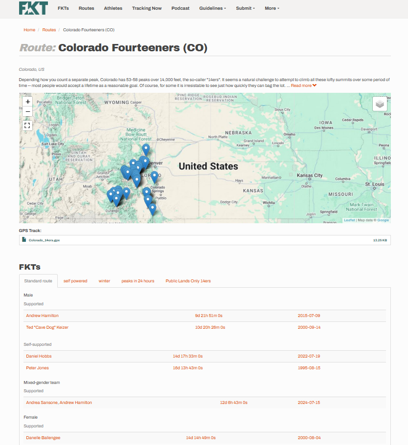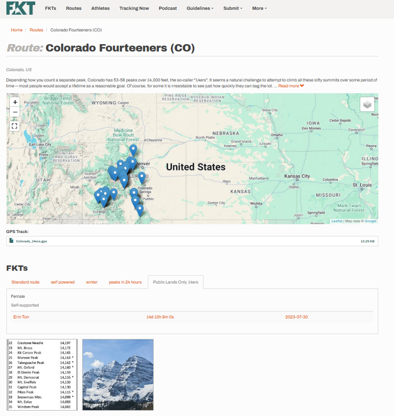 One precedent: Following Erin Ton's controversial FKT in summer 2023, the FKT site split the Colorado Fourteeners route into standard and public lands only (see screenshots below). Unlike that controversy, Michelino (1) complied with the route's legacy (six of seven prior speed records; four of five official FKTs) and (2) was fully transparent about using the old climber's trail from the outset.